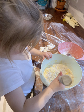 We bakken ook minimaal 1 keer per week samen. Pannekoekjes of een cake. Ze vinden het helemaal geweldig om met het meel te spelen en mogen dus ook altijd lekker kliederen. Ik geef ze dan ieder een handje meel waar ze mee mogen spelen. De rest is nodig voor het beslag en ook daar helpen ze dan mee. Roeren, eitje tikken, fruit, groenten en kruiden erdoor.